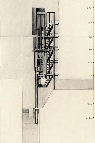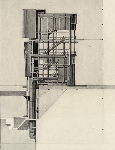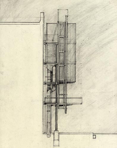 An essential feature of UL-B45 is the incinerator, which burns 2 tons of trash each day to create 35,000 BTUs of energy. A portion of this energy is transferred to a turbine to generate electricity and provide hot water and steam for the residents. The outer curtain wall provides a panel, 20 ft. x 15 ft., that residents can use as a banner to position any kind of message or propaganda.